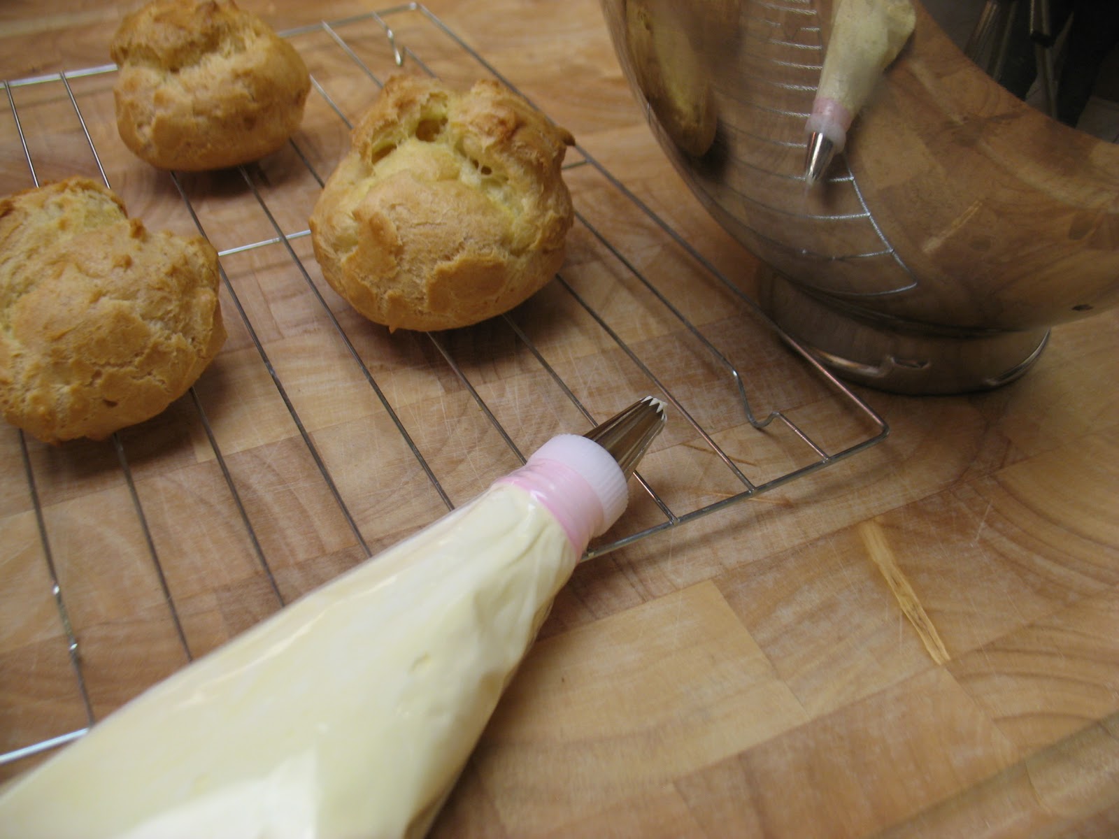 So onto the recipe. I did a half batch (about 8 large profiteroles), figuring that the holidays did enough damage to our tummies and thighs, but here is double that, which would probably make about 16 large, or 24 smaller cream puffs. The larger the cream puffs get, the harder it is to get the middle completely dry/cooked through, but this is still okay; just take out all the moist egg-like dough and it makes for more filling room, which you want. ;)